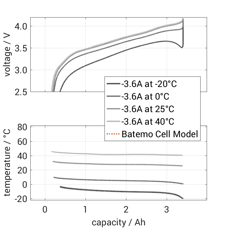 The nominal capacity origi­nates from the manufac­tur­er’s data sheet, if avail­able. When the data sheet is unavail­able, the nominal capacity is estimated. Batemo measured the C/10 capacity by discharging the cell at an ambient temper­a­ture of 25°C from 100% with a constant current of 0.36A (0.1C) until reaching the voltage of 2.5V. The thermal boundary condi­tion is free convection.