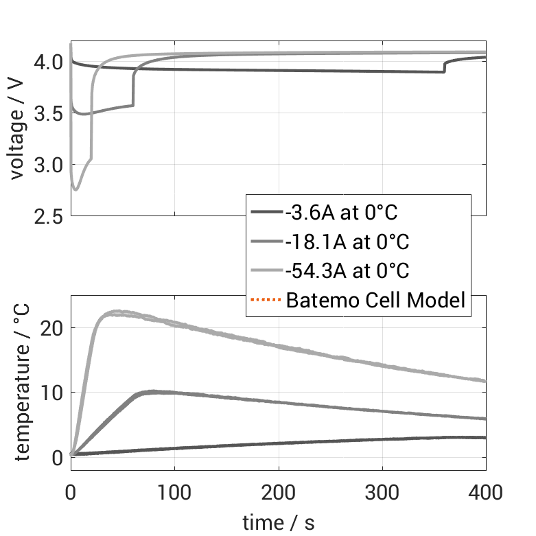 Moreover, the Batemo Cell Model valida­tion will be fully trans­parent. The Batemo Cell Data contains the raw measure­ment and simula­tion data. For all exper­i­ments the voltage, temper­a­ture, power and energy accura­cies are calcu­lated. This allows straight-forward evalu­a­tion and analysis of the Batemo Cell Model validity. The graphs show a selec­tion of charac­ter­istic data of the cell Panasonic NCR2070-C to evaluate the cell perfor­mance. The predic­tion of the Batemo Cell Model is included as soon as the Batemo Cell Model is finished.