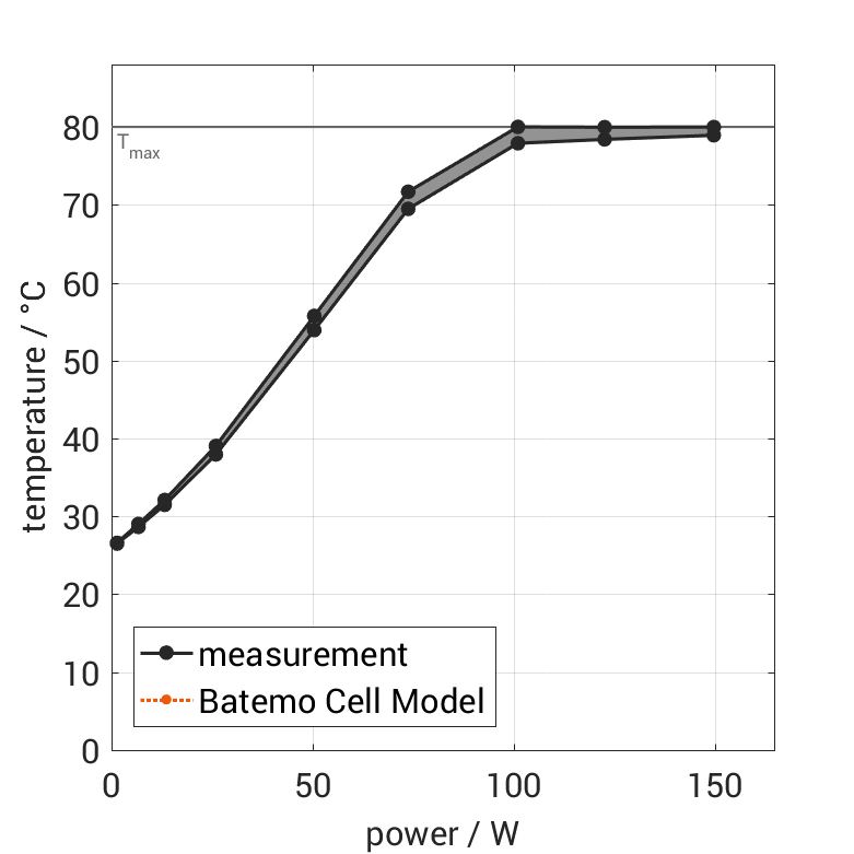The cell is discharged from 100% SOC with different constant currents at 25°C. The thermal boundary condi­tion is free convec­tion. The measure­ment stops when reaching either the voltage of 2.5V or the surface temper­a­ture of 80°C. The graph shows the cell surface temper­a­ture at the end and the derived average power of the experiment.