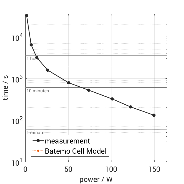 The cell is discharged from 100% SOC with different constant currents at 25°C. The thermal boundary condi­tion is free convec­tion. The measure­ment stops when reaching either the voltage of 2.5V or the surface temper­a­ture of 80°C. The graph shows the derived exper­i­ment duration and average power of the experiment.