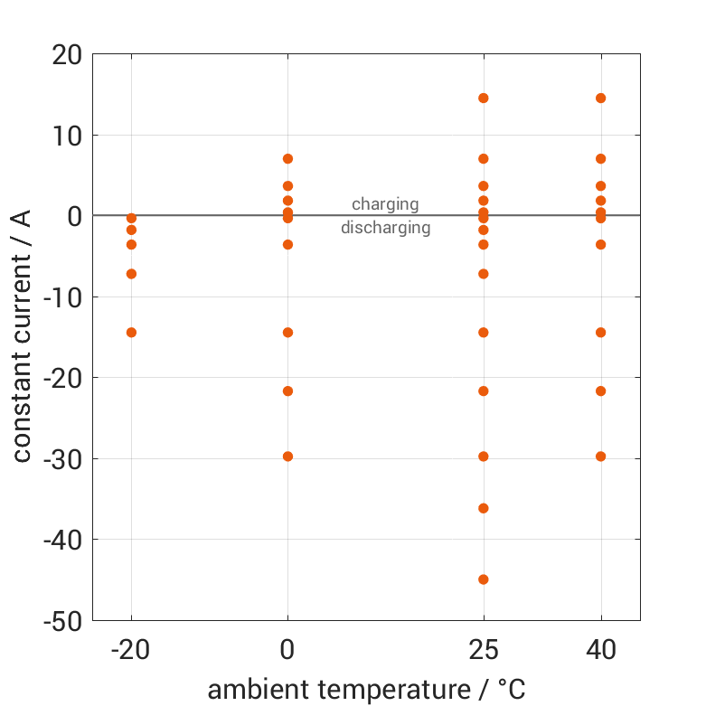The cell is discharged from 100% SOC or charged from 0% SOC with different constant currents at different ambient temper­a­tures. The thermal boundary condi­tion is free convec­tion. The measure­ment stops when reaching either the voltage of 2.5V or 4.2V or the surface temper­a­ture of 80°C. The graph shows for which ambient temper­a­tures and charging and discharging constant currents measure­ments are available.