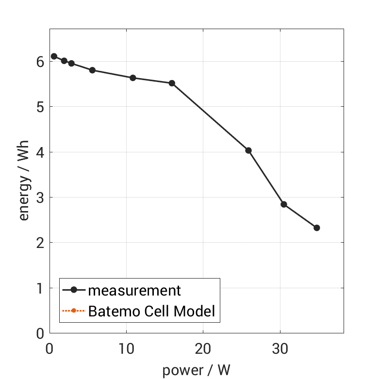 Moreover, the Batemo Cell Model validation will be fully transparent. The Batemo Cell Data contains the raw measurement and simulation data. For all experiments the voltage, temperature, power and energy accuracies are calculated. This allows straight-forward evaluation and analysis of the Batemo Cell Model validity. The graphs show a selection of characteristic data of the cell REAL-CELL IFR18650EC-1.8Ah to evaluate the cell performance. The prediction of the Batemo Cell Model is included as soon as the Batemo Cell Model is finished.