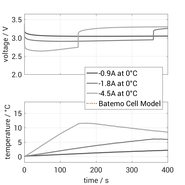 The Batemo Cell Model of the lithium-ion battery cell REAL-CELL IFR18650EC-1.8Ah is a high-precision, physical cell model with global validity. As a digital twin it seamlessly integrates into your research, development and battery analytics by basing your decisions on simulations. See the details to learn more about the features and capabilities of the Batemo Cell Model. Batemo demonstrates the accuracy and validity of the Batemo Cell Model by comparing battery simulation and measurement data in the range given below. Validation is extensive, experimental characterization covers the total operational area of the cell: At low and high temperatures, up to the maximal current and in the whole state of charge range.