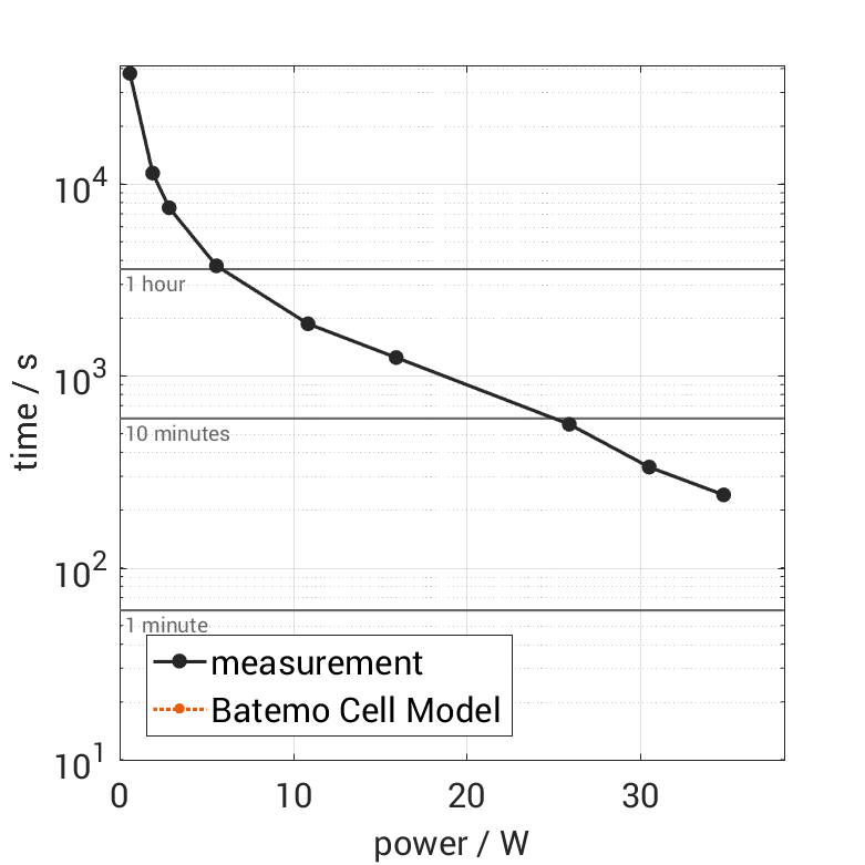 All quantities are measurement results from the Batemo battery laboratory. The continuous power is the highest power that completely discharges the cell without overheating it. Therefore, the cell is discharged from 100% state of charge (SOC) at an ambient temperature of 25°C with a constant current until a residual state of charge of 10% and either the lower voltage limit of 2.0V or 90% of the maximum surface temperature ( 54°C) is reached. The peak power is the power the cell can supply for 5 minutes. The cell is therefore discharged from 100% SOC at an ambient temperature of 25°C with a constant current until it reaches either the lower voltage limit of 2.0V or the maximum surface temperature of 60°C after 5 minutes. For cells that reach the maximum temperature limit, the measured power is directly taken as peak power. For cells that do not reach the maximum surface temperature after 5 minutes because they reach the lower voltage limit first, the measured power is multiplied by a correction factor that estimates the power that would have heated the cell to the maximum surface temperature within 5 minutes. The thermal boundary condition is free convection. These operating conditions may be outside the cell manufacturer’s specification. |