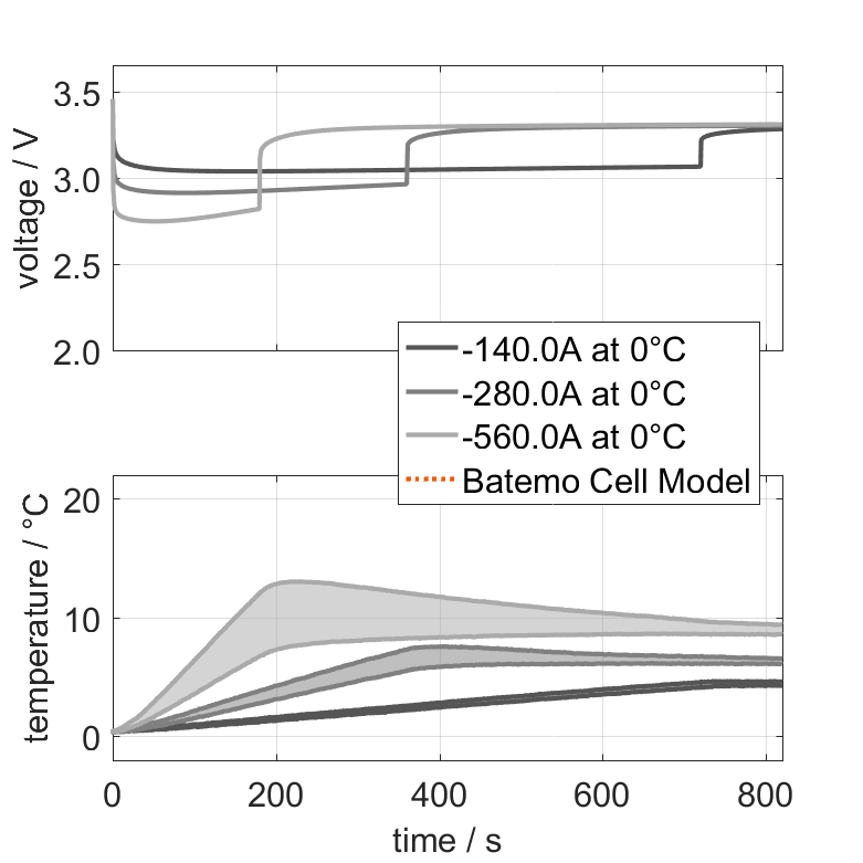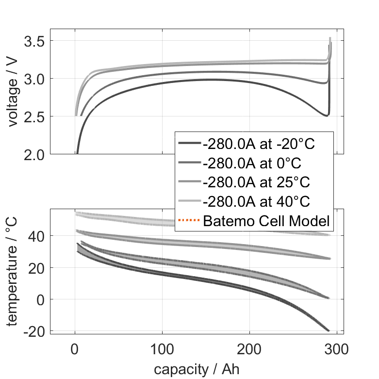 The Batemo Cell Model of the lithium-ion battery cell REPT CB71173204EB-280Ah is a high-precision, physical cell model with global validity. As a digital twin it seamlessly integrates into your research, development and battery analytics by basing your decisions on simulations. See the details to learn more about the features and capabilities of the Batemo Cell Model. Batemo demonstrates the accuracy and validity of the Batemo Cell Model by comparing battery simulation and measurement data in the range given below. Validation is extensive, experimental characterization covers the total operational area of the cell: At low and high temperatures, up to the maximal current and in the whole state of charge range.