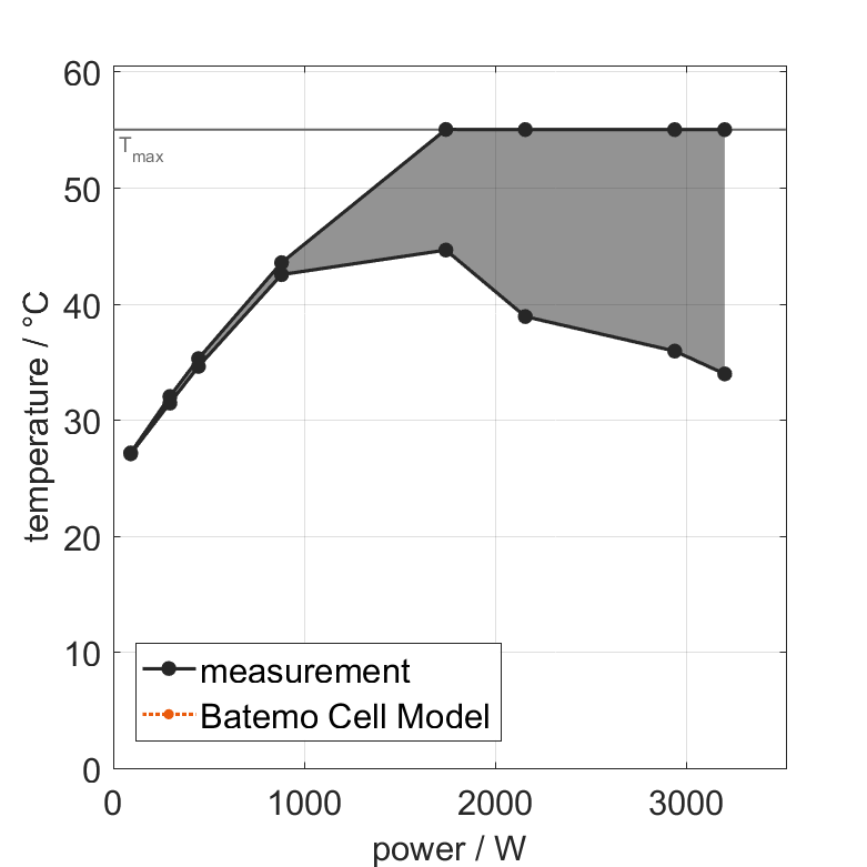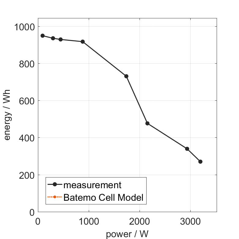 All quantities are measurement results from the Batemo battery laboratory. The continuous power is the highest power that completely discharges the cell without overheating it. Therefore, the cell is discharged from 100% state of charge (SOC) at an ambient temperature of 25°C with a constant current until a residual state of charge of 10% and either the lower voltage limit of 2V or 90% of the maximum surface temperature ( 50°C) is reached. The peak power is the power the cell can supply for 5 minutes. The cell is therefore discharged from 100% SOC at an ambient temperature of 25°C with a constant current until it reaches either the lower voltage limit of 2V or the maximum surface temperature of 55°C after 5 minutes. For cells that reach the maximum temperature limit, the measured power is directly taken as peak power. For cells that do not reach the maximum surface temperature after 5 minutes because they reach the lower voltage limit first, the measured power is multiplied by a correction factor that estimates the power that would have heated the cell to the maximum surface temperature within 5 minutes. The thermal boundary condition is free convection. These operating conditions may be outside the cell manufacturer’s specification. |