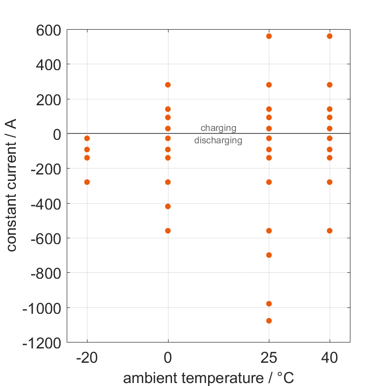 The cell is discharged from 100% SOC or charged from 0% SOC with different constant currents at different ambient temperatures. The thermal boundary condition is free convection. The measurement stops when reaching either the voltage of 2V or 3.65V or the surface temperature of 55°C. The graph shows for which ambient temperatures and charging and discharging constant currents measurements are available.