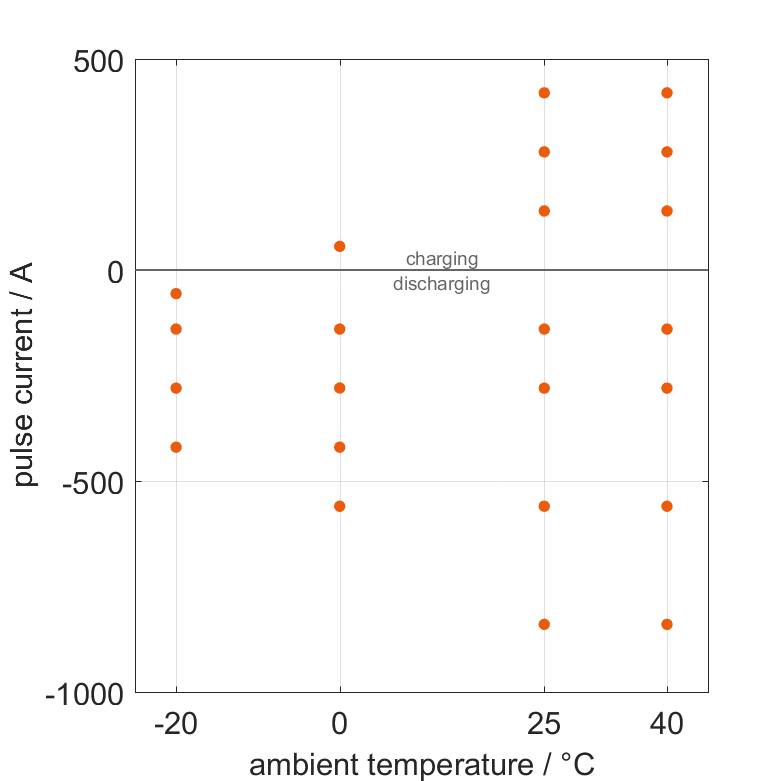 The cell is discharged from 100% SOC or charged from 0% SOC with current pulses followed by no-load phases at different ambient temperatures. The thermal boundary condition is free convection. The measurement stops when reaching either the voltage of 2V or 3.65V or the surface temperature of 55°C. The graph shows for which ambient temperatures and pulse currents measurements are available.