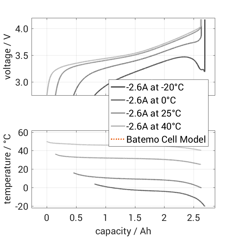 The nominal capacity originates from the manufacturer’s data sheet, if available. When the data sheet is unavailable, the nominal capacity is estimated. Batemo measured the C/10 capacity by discharging the cell at an ambient temperature of 25°C from 100% with a constant current of 0.26A (0.1C) until reaching the voltage of 2.8V. The thermal boundary condition is free convection. |