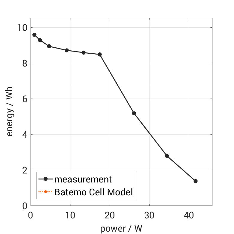Moreover, the Batemo Cell Model validation will be fully transparent. The Batemo Cell Data contains the raw measurement and simulation data. For all experiments the voltage, temperature, power and energy accuracies are calculated. This allows straight-forward evaluation and analysis of the Batemo Cell Model validity. The graphs show a selection of characteristic data of the cell Samsung ICR18650-26J to evaluate the cell performance. The prediction of the Batemo Cell Model is included as soon as the Batemo Cell Model is finished.