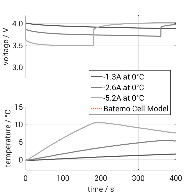 The Batemo Cell Model of the lithium-ion battery cell Samsung ICR18650-26J is a high-precision, physical cell model with global validity. As a digital twin it seamlessly integrates into your research, development and battery analytics by basing your decisions on simulations. See the details to learn more about the features and capabilities of the Batemo Cell Model. Batemo demonstrates the accuracy and validity of the Batemo Cell Model by comparing battery simulation and measurement data in the range given below. Validation is extensive, experimental characterization covers the total operational area of the cell: At low and high temperatures, up to the maximal current and in the whole state of charge range.