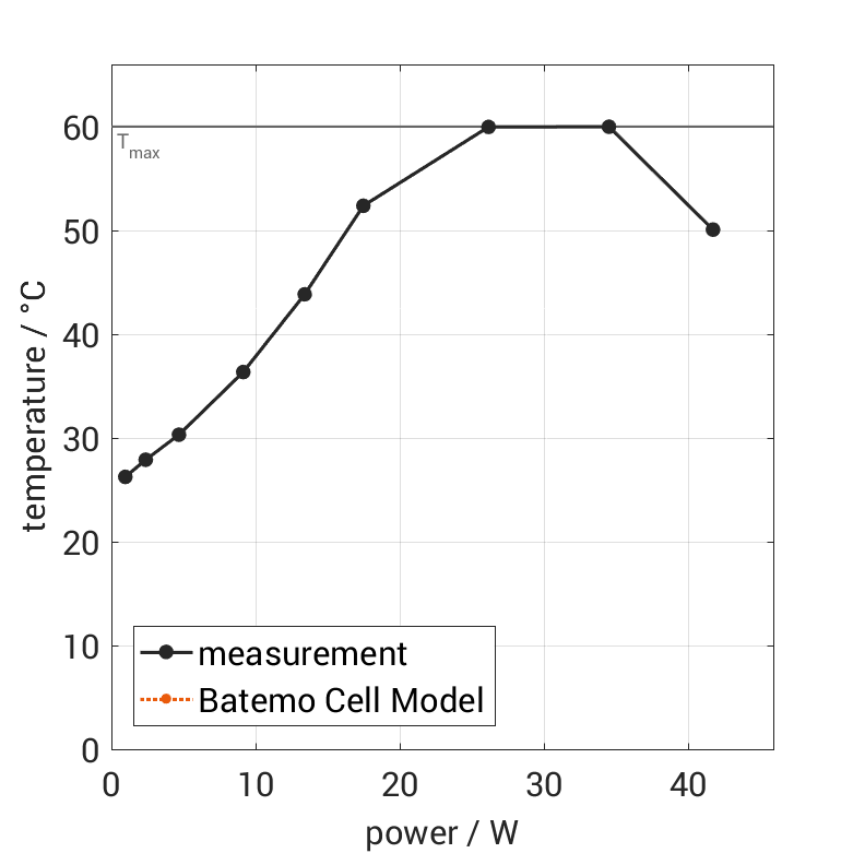 All quantities are measurement results from the Batemo battery laboratory. The continuous power is the highest power that completely discharges the cell without overheating it. Therefore, the cell is discharged from 100% state of charge (SOC) at an ambient temperature of 25°C with a constant current until a residual state of charge of 10% and either the lower voltage limit of 2.8V or 90% of the maximum surface temperature ( 54°C) is reached. The peak power is the power the cell can supply for 5 minutes. The cell is therefore discharged from 100% SOC at an ambient temperature of 25°C with a constant current until it reaches either the lower voltage limit of 2.8V or the maximum surface temperature of 60°C after 5 minutes. For cells that reach the maximum temperature limit, the measured power is directly taken as peak power. For cells that do not reach the maximum surface temperature after 5 minutes because they reach the lower voltage limit first, the measured power is multiplied by a correction factor that estimates the power that would have heated the cell to the maximum surface temperature within 5 minutes. The thermal boundary condition is free convection. These operating conditions may be outside the cell manufacturer’s specification. |