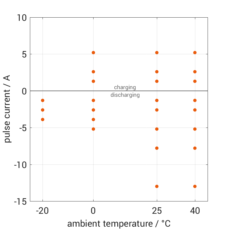 The cell is discharged from 100% SOC or charged from 0% SOC with current pulses followed by no-load phases at different ambient temperatures. The thermal boundary condition is free convection. The measurement stops when reaching either the voltage of 2.8V or 4.2V or the surface temperature of 60°C. The graph shows for which ambient temperatures and pulse currents measurements are available.