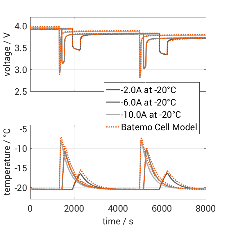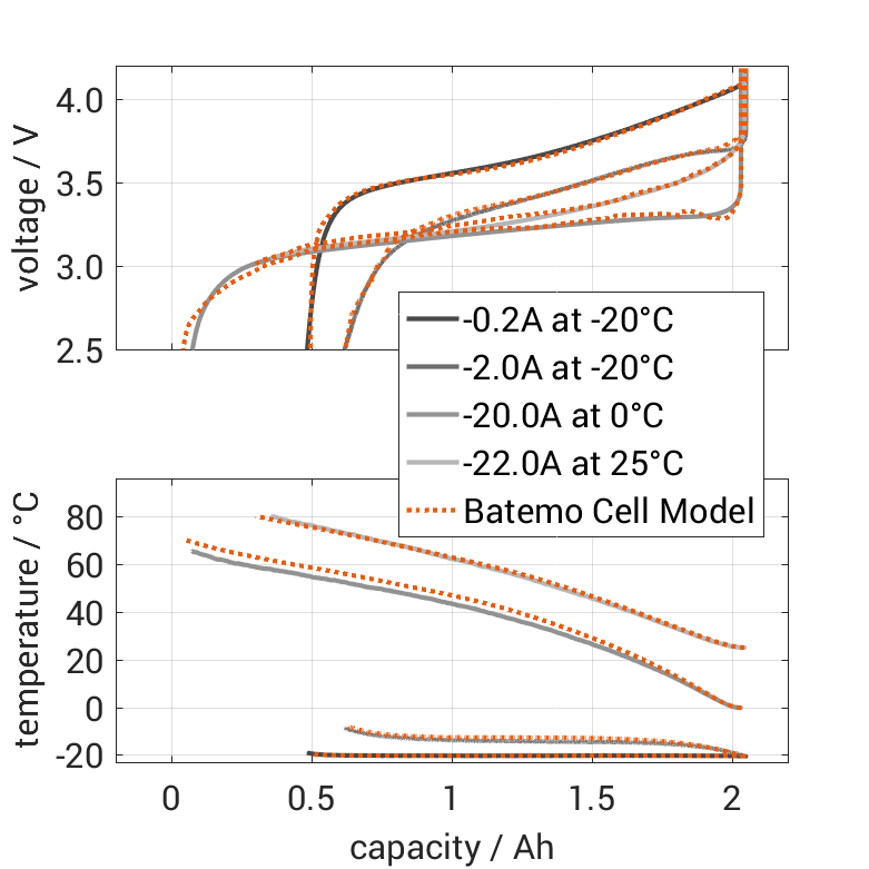 Batemo demonstrates the accuracy and validity of the Batemo Cell Model by comparing battery simulation and measurement data in the range given below. Validation is extensive, experimental characterization covers the total operational area of the cell: At low and high temperatures, up to the maximal current and in the whole state of charge range.