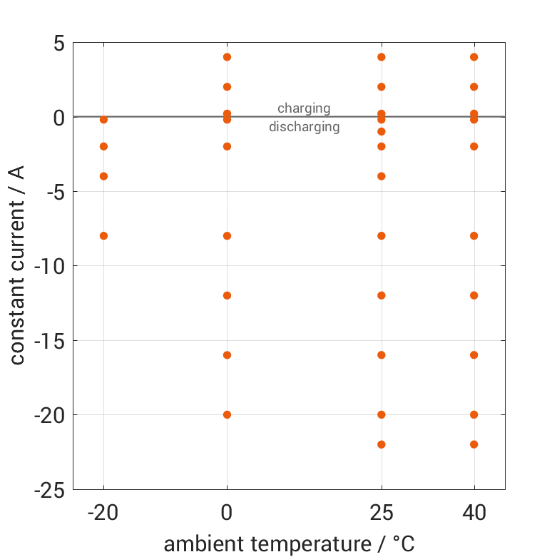The cell is discharged from 100% SOC or charged from 0% SOC with different constant currents at different ambient temperatures. The thermal boundary condition is free convection. The measurement stops when reaching either the voltage of 2.5V or 4.2V or the surface temperature of 80°C. The graph shows for which ambient temperatures and charging and discharging constant currents measurements are available.