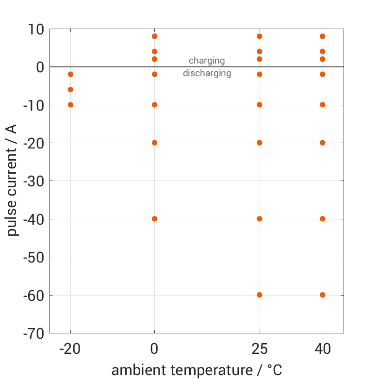The cell is discharged from 100% SOC or charged from 0% SOC with current pulses followed by no-load phases at different ambient temperatures. The thermal boundary condition is free convection. The measurement stops when reaching either the voltage of 2.5V or 4.2V or the surface temperature of 80°C. The graph shows for which ambient temperatures and pulse currents measurements are available.
