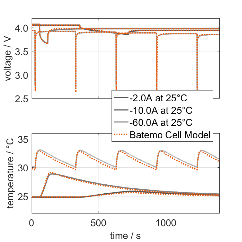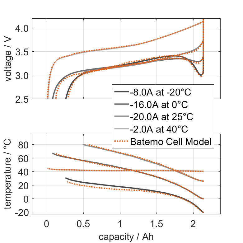 Batemo demonstrates the accuracy and validity of the Batemo Cell Model by comparing battery simulation and measurement data in the range given below. Validation is extensive, experimental characterization covers the total operational area of the cell: At low and high temperatures, up to the maximal current and in the whole state of charge range.