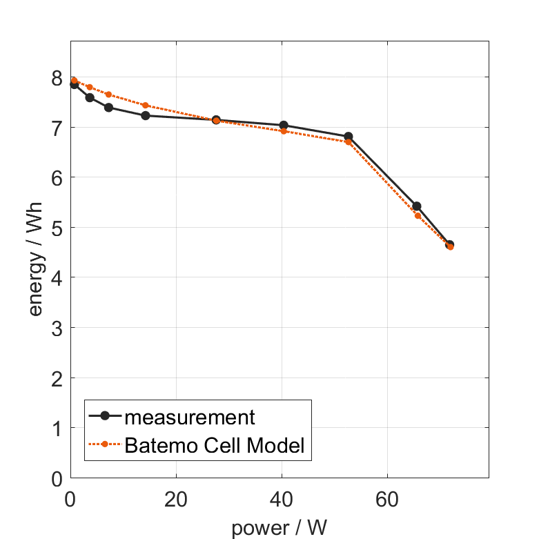 Moreover, the validation of the Batemo Cell Model is fully transparent. The Batemo Cell Data contains the raw measurement and simulation data. For all experiments the voltage, temperature, power and energy accuracies are calculated. This allows straight-forward evaluation and analysis of the Batemo Cell Model validity. The graphs show a selection of characteristic data of the cell Samsung INR18650-20R(4) to evaluate the cell performance.