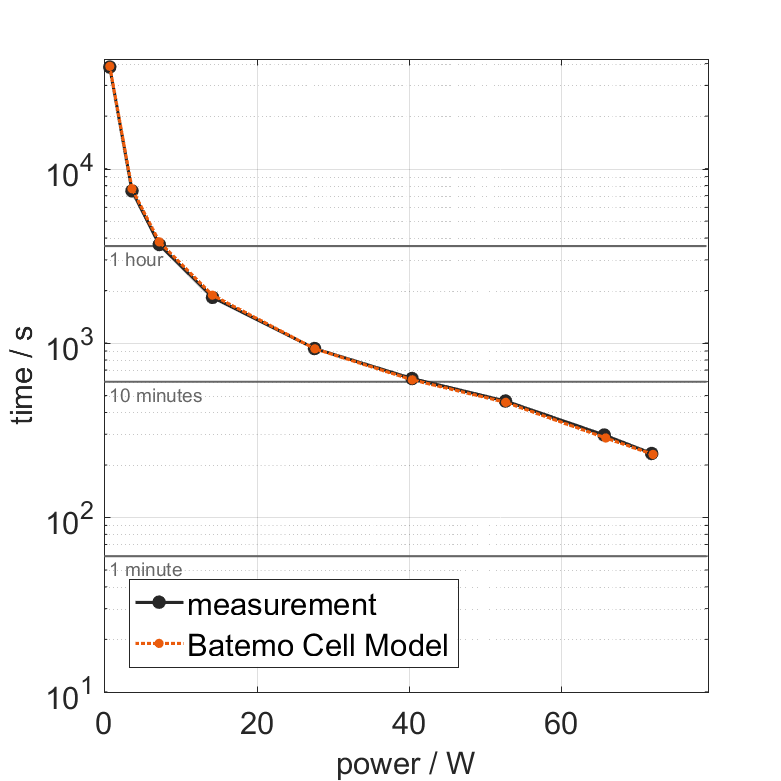 All quantities are measurement results from the Batemo battery laboratory. The continuous power is the highest power that completely discharges the cell without overheating it. Therefore, the cell is discharged from 100% state of charge (SOC) at an ambient temperature of 25°C with a constant current until a residual state of charge of 10% and either the lower voltage limit of 2.5V or 90% of the maximum surface temperature ( 72°C) is reached. The peak power is the power the cell can supply for 5 minutes. The cell is therefore discharged from 100% SOC at an ambient temperature of 25°C with a constant current until it reaches either the lower voltage limit of 2.5V or the maximum surface temperature of 80°C after 5 minutes. For cells that reach the maximum temperature limit, the measured power is directly taken as peak power. For cells that do not reach the maximum surface temperature after 5 minutes because they reach the lower voltage limit first, the measured power is multiplied by a correction factor that estimates the power that would have heated the cell to the maximum surface temperature within 5 minutes. The thermal boundary condition is free convection. These operating conditions may be outside the cell manufacturer’s specification. |