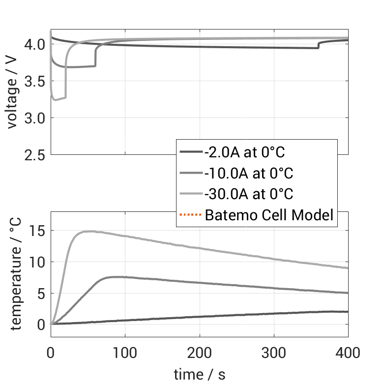 The Batemo Cell Model of the lithium-ion battery cell Samsung INR18650-20S(3) is a high-precision, physical cell model with global validity. As a digital twin it seamlessly integrates into your research, development and battery analytics by basing your decisions on simulations. See the details to learn more about the features and capabilities of the Batemo Cell Model. Batemo demonstrates the accuracy and validity of the Batemo Cell Model by comparing battery simulation and measurement data in the range given below. Validation is extensive, experimental characterization covers the total operational area of the cell: At low and high temperatures, up to the maximal current and in the whole state of charge range.