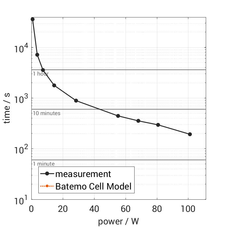 All quantities are measurement results from the Batemo battery laboratory. The continuous power is the highest power that completely discharges the cell without overheating it. Therefore, the cell is discharged from 100% state of charge (SOC) at an ambient temperature of 25°C with a constant current until a residual state of charge of 10% and either the lower voltage limit of 2.5V or 90% of the maximum surface temperature ( 72°C) is reached. The peak power is the power the cell can supply for 5 minutes. The cell is therefore discharged from 100% SOC at an ambient temperature of 25°C with a constant current until it reaches either the lower voltage limit of 2.5V or the maximum surface temperature of 80°C after 5 minutes. For cells that reach the maximum temperature limit, the measured power is directly taken as peak power. For cells that do not reach the maximum surface temperature after 5 minutes because they reach the lower voltage limit first, the measured power is multiplied by a correction factor that estimates the power that would have heated the cell to the maximum surface temperature within 5 minutes. The thermal boundary condition is free convection. These operating conditions may be outside the cell manufacturer’s specification. |