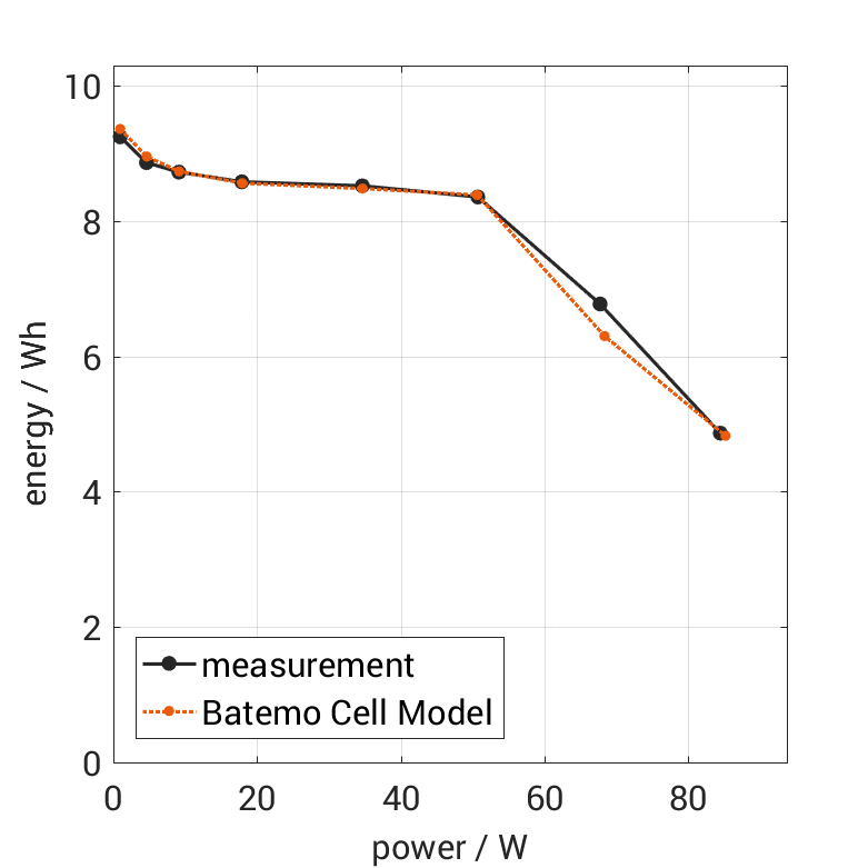The cell is discharged from 100% SOC with different constant currents at 25°C. The thermal boundary condi­tion is free convec­tion. The measure­ment stops when reaching either the voltage of 2.5V or the surface temper­a­ture of 80°C. The graph shows the derived exchanged energy and average power of the experiment.