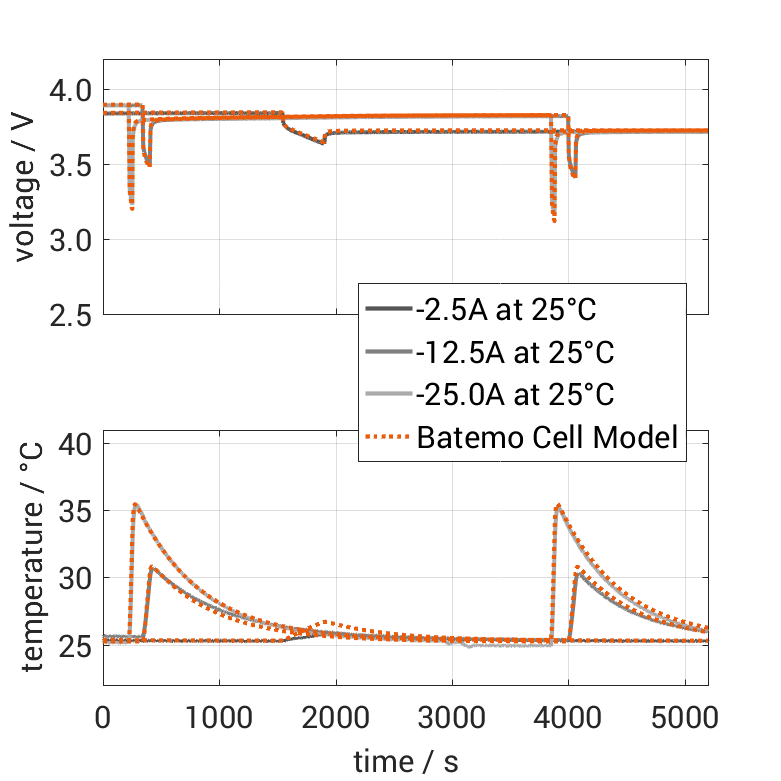 Batemo demon­strates the accuracy and validity of the Batemo Cell Model by comparing battery simula­tion and measure­ment data in the range given below. Valida­tion is exten­sive, exper­i­mental charac­ter­i­za­tion covers the total opera­tional area of the cell: At low and high temper­a­tures, up to the maximal current and in the whole state of charge range.