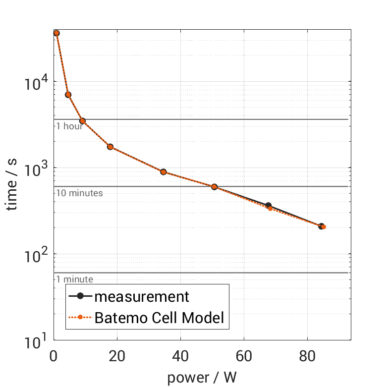 The cell is discharged from 100% SOC with different constant currents at 25°C. The thermal boundary condi­tion is free convec­tion. The measure­ment stops when reaching either the voltage of 2.5V or the surface temper­a­ture of 80°C. The graph shows the derived exper­i­ment duration and average power of the experiment.