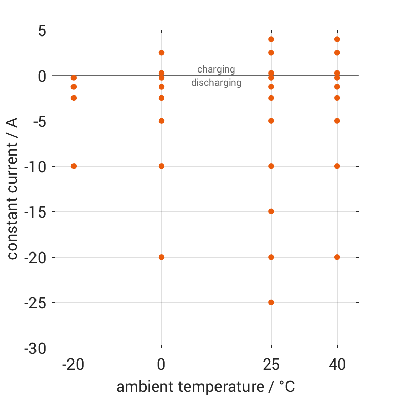 The cell is discharged from 100% SOC or charged from 0% SOC with different constant currents at different ambient temper­a­tures. The thermal boundary condi­tion is free convec­tion. The measure­ment stops when reaching either the voltage of 2.5V or 4.2V or the surface temper­a­ture of 80°C. The graph shows for which ambient temper­a­tures and charging and discharging constant currents measure­ments are available.