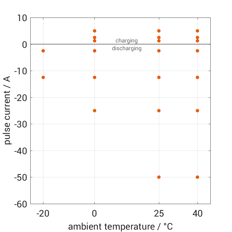 The cell is discharged from 100% SOC or charged from 0% SOC with current pulses followed by no-load phases at different ambient temper­a­tures. The thermal boundary condi­tion is free convec­tion. The measure­ment stops when reaching either the voltage of 2.5V or 4.2V or the surface temper­a­ture of 80°C. The graph shows for which ambient temper­a­tures and pulse currents measure­ments are available.