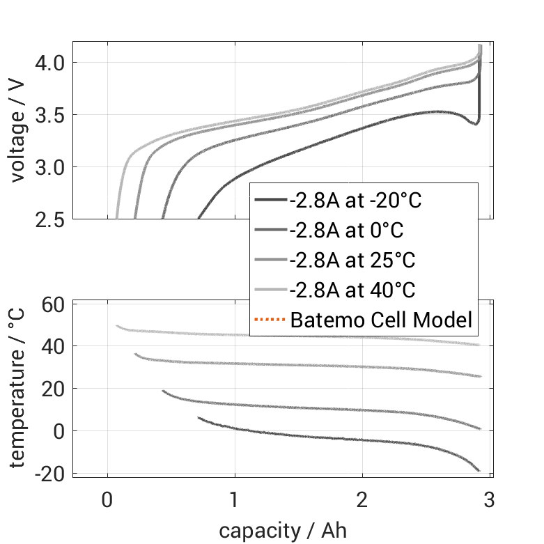 The nominal capacity originates from the manufacturer’s data sheet, if available. When the data sheet is unavailable, the nominal capacity is estimated. Batemo measured the C/10 capacity by discharging the cell at an ambient temperature of 25°C from 100% with a constant current of 0.28A (0.1C) until reaching the voltage of 2.5V. The thermal boundary condition is free convection. |