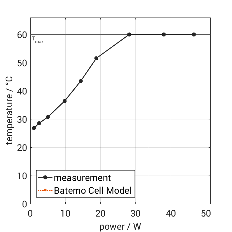 All quantities are measurement results from the Batemo battery laboratory. The continuous power is the highest power that completely discharges the cell without overheating it. Therefore, the cell is discharged from 100% state of charge (SOC) at an ambient temperature of 25°C with a constant current until a residual state of charge of 10% and either the lower voltage limit of 2.5V or 90% of the maximum surface temperature ( 54°C) is reached. The peak power is the power the cell can supply for 5 minutes. The cell is therefore discharged from 100% SOC at an ambient temperature of 25°C with a constant current until it reaches either the lower voltage limit of 2.5V or the maximum surface temperature of 60°C after 5 minutes. For cells that reach the maximum temperature limit, the measured power is directly taken as peak power. For cells that do not reach the maximum surface temperature after 5 minutes because they reach the lower voltage limit first, the measured power is multiplied by a correction factor that estimates the power that would have heated the cell to the maximum surface temperature within 5 minutes. The thermal boundary condition is free convection. These operating conditions may be outside the cell manufacturer’s specification. |