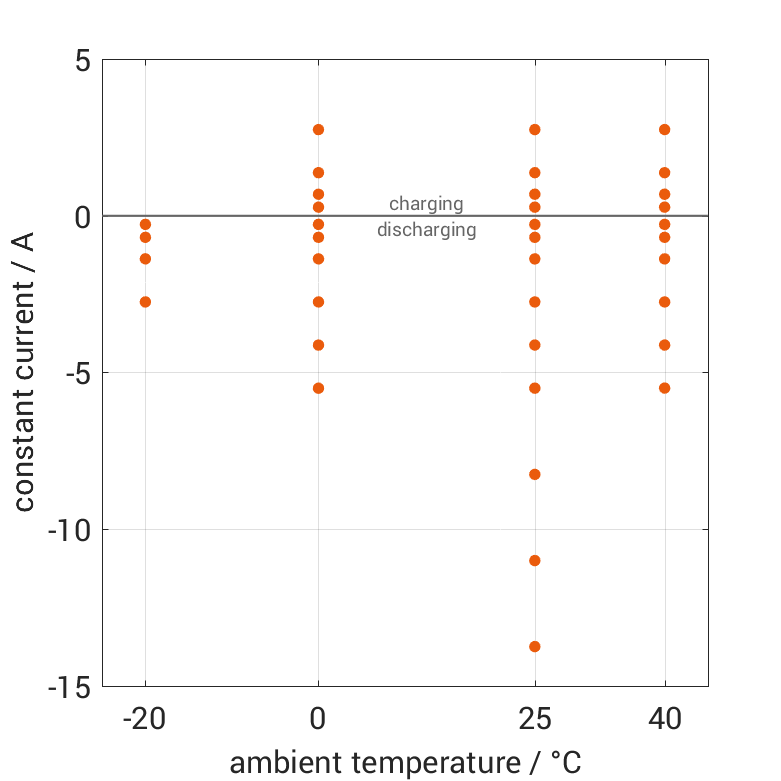 The cell is discharged from 100% SOC or charged from 0% SOC with different constant currents at different ambient temperatures. The thermal boundary condition is free convection. The measurement stops when reaching either the voltage of 2.5V or 4.2V or the surface temperature of 60°C. The graph shows for which ambient temperatures and charging and discharging constant currents measurements are available.