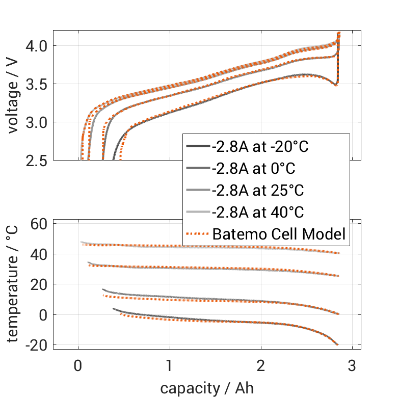 Batemo demon­strates the accuracy and validity of the Batemo Cell Model by comparing battery simula­tion and measure­ment data in the range given below. Valida­tion is exten­sive, exper­i­mental charac­ter­i­za­tion covers the total opera­tional area of the cell: At low and high temper­a­tures, up to the maximal current and in the whole state of charge range.