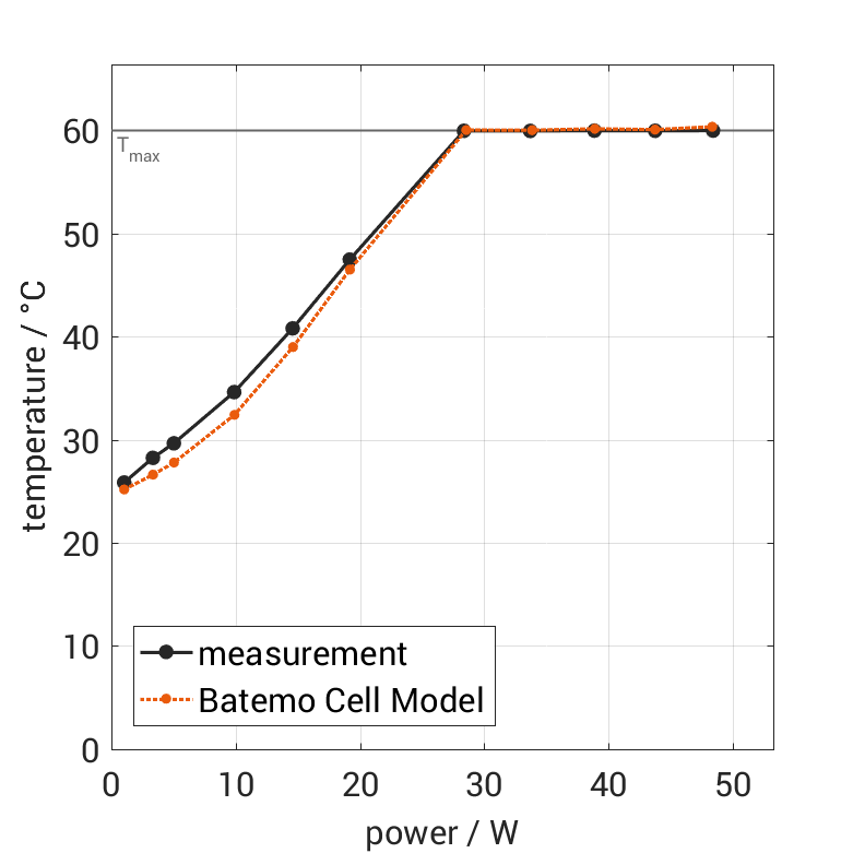The cell is discharged from 100% SOC with different constant currents at 25°C. The thermal boundary condi­tion is free convec­tion. The measure­ment stops when reaching either the voltage of 2.5V or the surface temper­a­ture of 60°C. The graph shows the cell surface temper­a­ture at the end and the derived average power of the experiment.