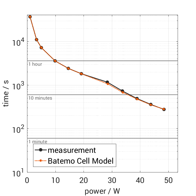 The cell is discharged from 100% SOC with different constant currents at 25°C. The thermal boundary condi­tion is free convec­tion. The measure­ment stops when reaching either the voltage of 2.5V or the surface temper­a­ture of 60°C. The graph shows the derived exper­i­ment duration and average power of the experiment.