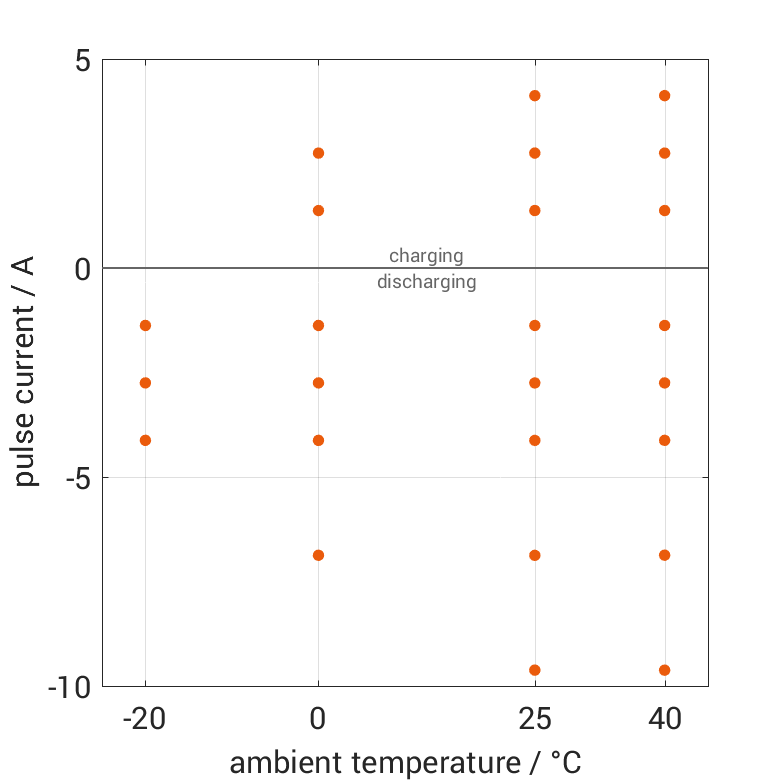 The cell is discharged from 100% SOC or charged from 0% SOC with current pulses followed by no-load phases at different ambient temper­a­tures. The thermal boundary condi­tion is free convec­tion. The measure­ment stops when reaching either the voltage of 2.5V or 4.2V or the surface temper­a­ture of 60°C. The graph shows for which ambient temper­a­tures and pulse currents measure­ments are available.