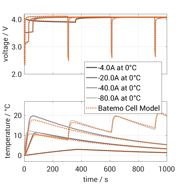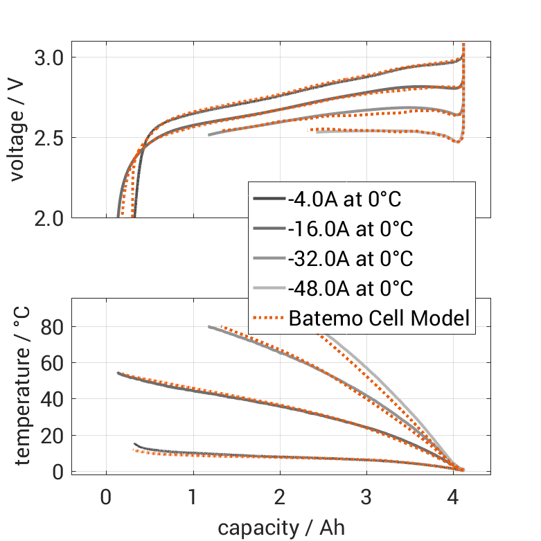 Batemo demonstrates the accuracy and validity of the Batemo Cell Model by comparing battery simulation and measurement data in the range given below. Validation is extensive, experimental characterization covers the total operational area of the cell: At low and high temperatures, up to the maximal current and in the whole state of charge range.