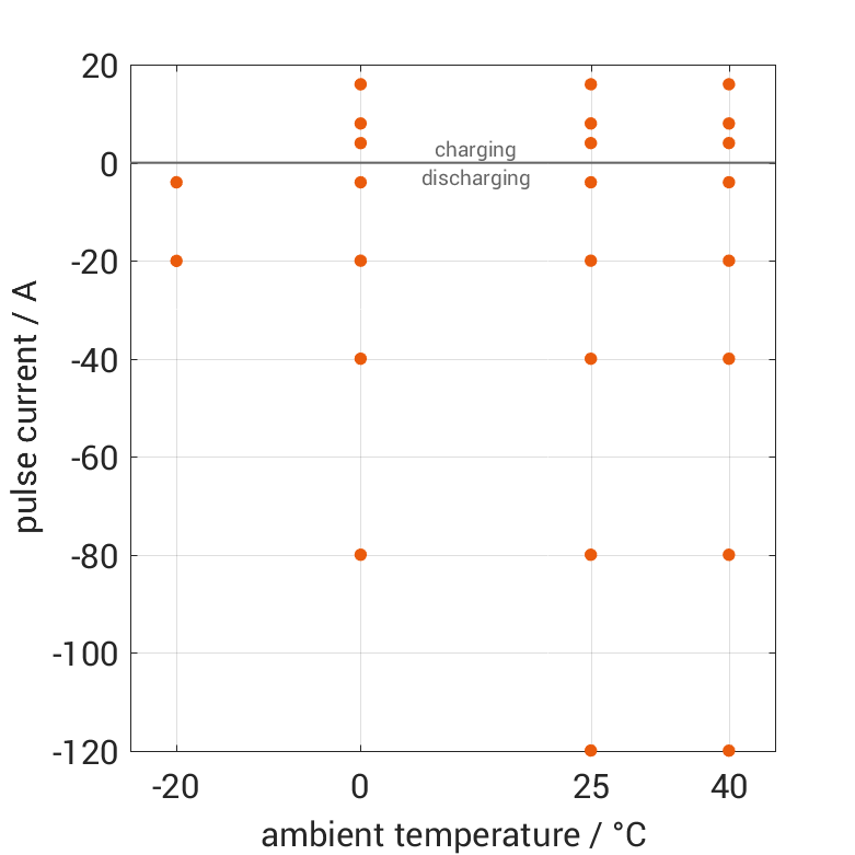 The cell is discharged from 100% SOC or charged from 0% SOC with current pulses followed by no-load phases at different ambient temperatures. The thermal boundary condition is free convection. The measurement stops when reaching either the voltage of 2.0V or 4.2V or the surface temperature of 80°C. The graph shows for which ambient temperatures and pulse currents measurements are available.