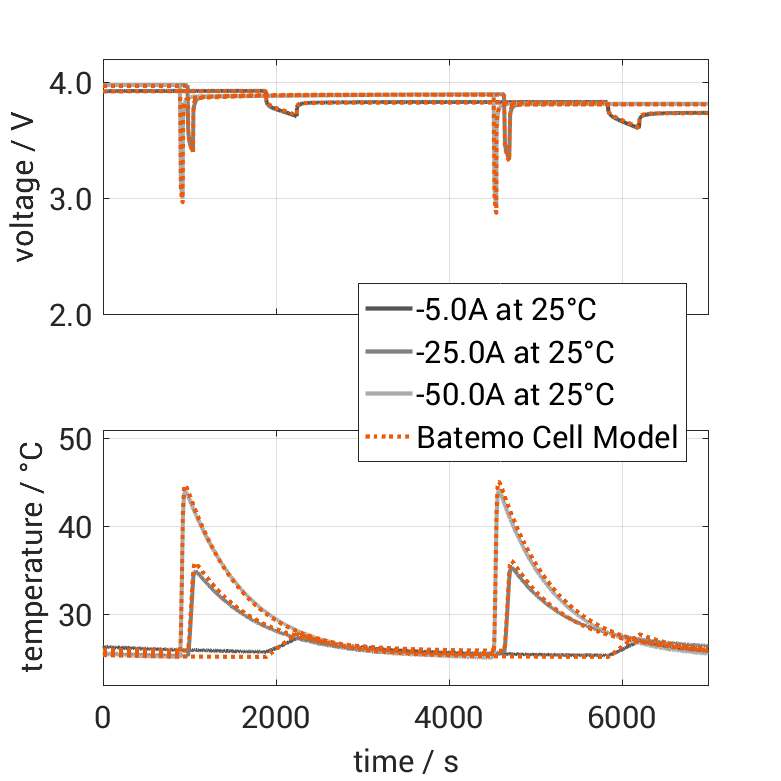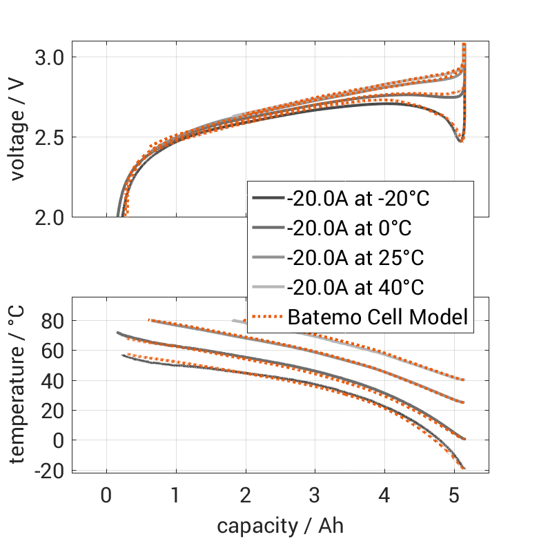 Batemo demon­strates the accuracy and validity of the Batemo Cell Model by comparing battery simula­tion and measure­ment data in the range given below. Valida­tion is exten­sive, exper­i­mental charac­ter­i­za­tion covers the total opera­tional area of the cell: At low and high temper­a­tures, up to the maximal current and in the whole state of charge range.