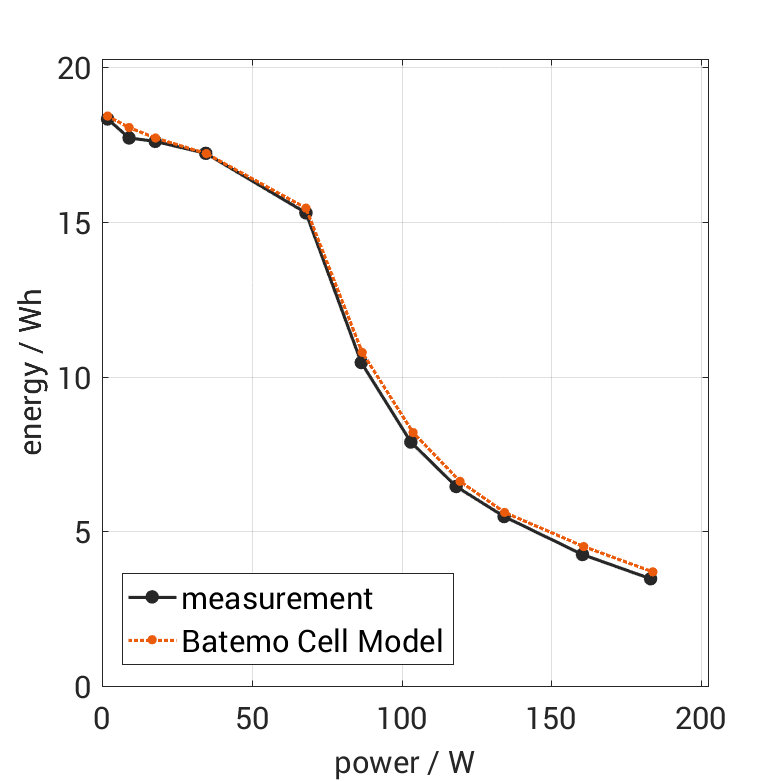 The cell is discharged from 100% SOC with different constant currents at 25°C. The thermal boundary condi­tion is free convec­tion. The measure­ment stops when reaching either the voltage of 2.0V or the surface temper­a­ture of 80°C. The graph shows the derived exchanged energy and average power of the experiment.