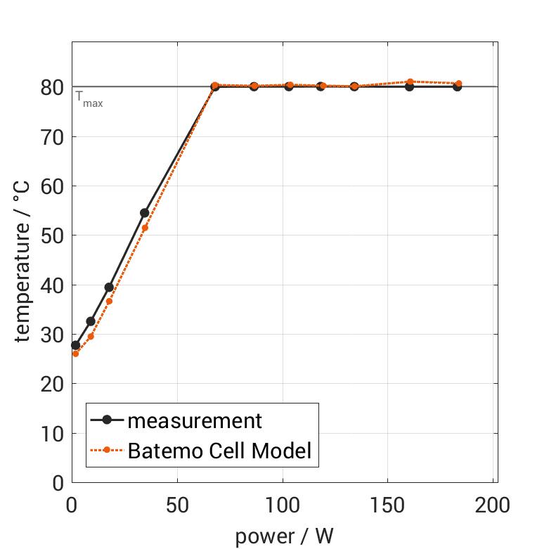 The cell is discharged from 100% SOC with different constant currents at 25°C. The thermal boundary condi­tion is free convec­tion. The measure­ment stops when reaching either the voltage of 2.0V or the surface temper­a­ture of 80°C. The graph shows the cell surface temper­a­ture at the end and the derived average power of the experiment.