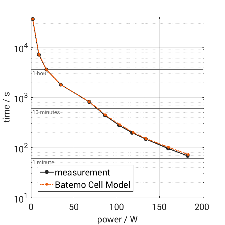 The cell is discharged from 100% SOC with different constant currents at 25°C. The thermal boundary condi­tion is free convec­tion. The measure­ment stops when reaching either the voltage of 2.0V or the surface temper­a­ture of 80°C. The graph shows the derived exper­i­ment duration and average power of the experiment.