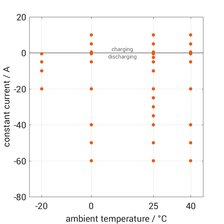 The cell is discharged from 100% SOC or charged from 0% SOC with different constant currents at different ambient temper­a­tures. The thermal boundary condi­tion is free convec­tion. The measure­ment stops when reaching either the voltage of 2.0V or 4.2V or the surface temper­a­ture of 80°C. The graph shows for which ambient temper­a­tures and charging and discharging constant currents measure­ments are available.