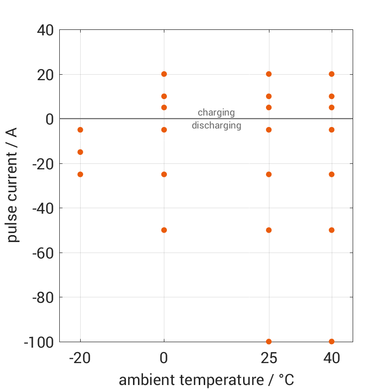 The cell is discharged from 100% SOC or charged from 0% SOC with current pulses followed by no-load phases at different ambient temper­a­tures. The thermal boundary condi­tion is free convec­tion. The measure­ment stops when reaching either the voltage of 2.0V or 4.2V or the surface temper­a­ture of 80°C. The graph shows for which ambient temper­a­tures and pulse currents measure­ments are available.
