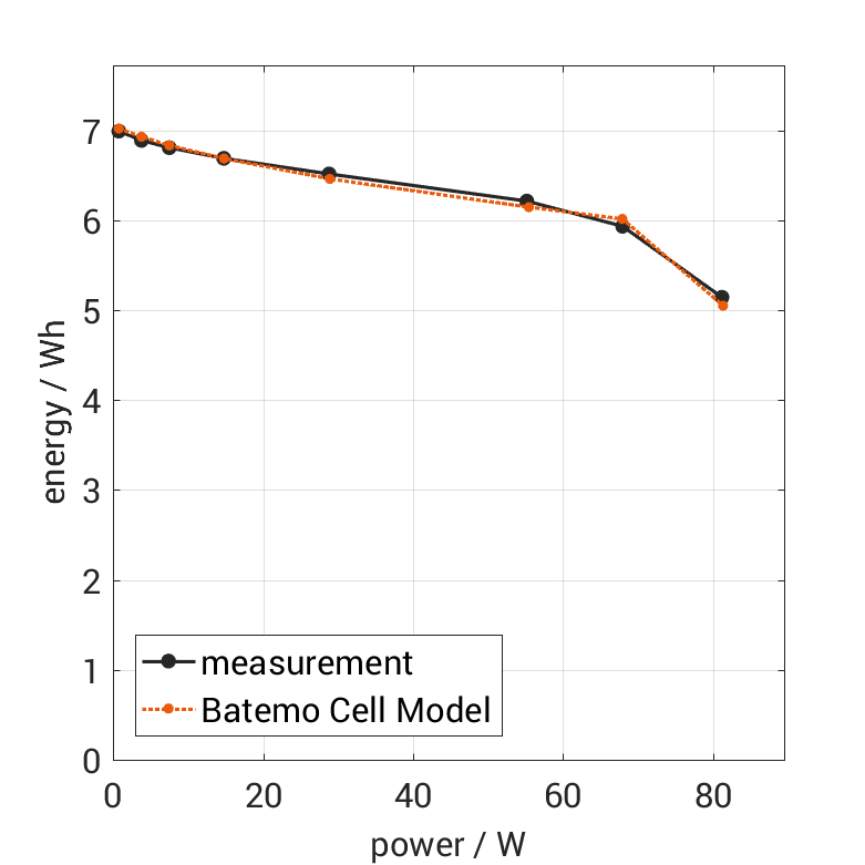 Moreover, the validation of the Batemo Cell Model is fully transparent. The Batemo Cell Data contains the raw measurement and simulation data. For all experiments the voltage, temperature, power and energy accuracies are calculated. This allows straight-forward evaluation and analysis of the Batemo Cell Model validity. The graphs show a selection of characteristic data of the cell Sanyo UR18650-RX to evaluate the cell performance.