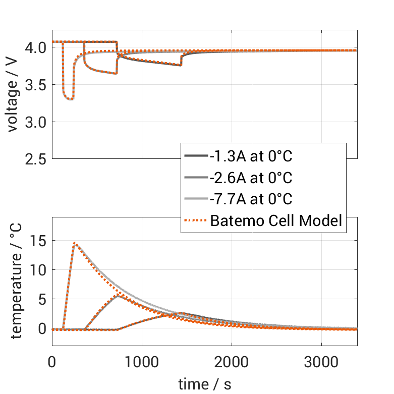 Batemo demonstrates the accuracy and validity of the Batemo Cell Model by comparing battery simulation and measurement data in the range given below. Validation is extensive, experimental characterization covers the total operational area of the cell: At low and high temperatures, up to the maximal current and in the whole state of charge range.