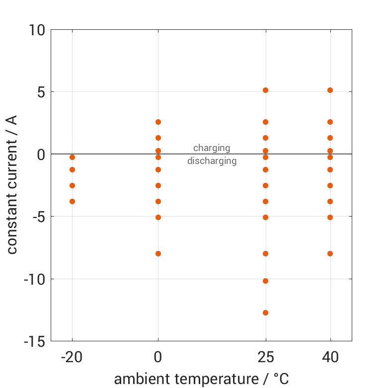 The cell is discharged from 100% SOC or charged from 0% SOC with different constant currents at different ambient temperatures. The thermal boundary condition is free convection. The measurement stops when reaching either the voltage of 2.5V or 4.23V or the surface temperature of 60°C. The graph shows for which ambient temperatures and charging and discharging constant currents measurements are available.