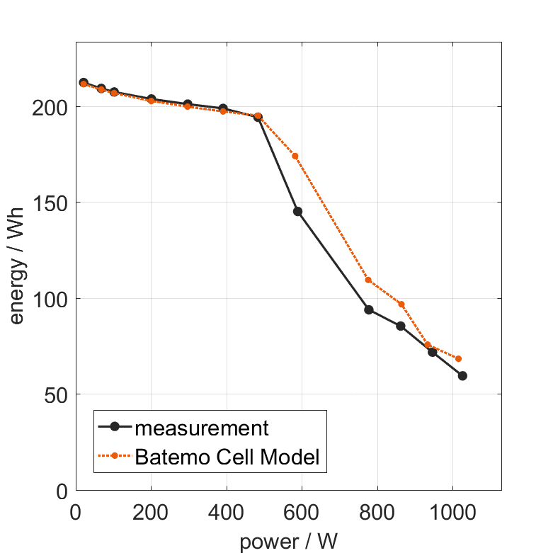All quantities are measurement results from the Batemo battery laboratory. The continuous power is the highest power that completely discharges the cell without overheating it. Therefore, the cell is discharged from 100% state of charge (SOC) at an ambient temperature of 25°C with a constant current until a residual state of charge of 10% and either the lower voltage limit of 2.5V or 90% of the maximum surface temperature ( 54°C) is reached. The peak power is the power the cell can supply for 5 minutes. The cell is therefore discharged from 100% SOC at an ambient temperature of 25°C with a constant current until it reaches either the lower voltage limit of 2.5V or the maximum surface temperature of 60°C after 5 minutes. For cells that reach the maximum temperature limit, the measured power is directly taken as peak power. For cells that do not reach the maximum surface temperature after 5 minutes because they reach the lower voltage limit first, the measured power is multiplied by a correction factor that estimates the power that would have heated the cell to the maximum surface temperature within 5 minutes. The thermal boundary condition is free convection. These operating conditions may be outside the cell manufacturer’s specification. |