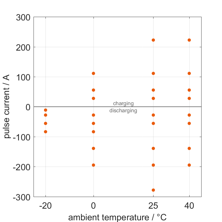 The cell is discharged from 100% SOC or charged from 0% SOC with current pulses followed by no-load phases at different ambient temperatures. The thermal boundary condition is free convection. The measurement stops when reaching either the voltage of 2.5V or 4.2V or the surface temperature of 60°C. The graph shows for which ambient temperatures and pulse currents measurements are available.
